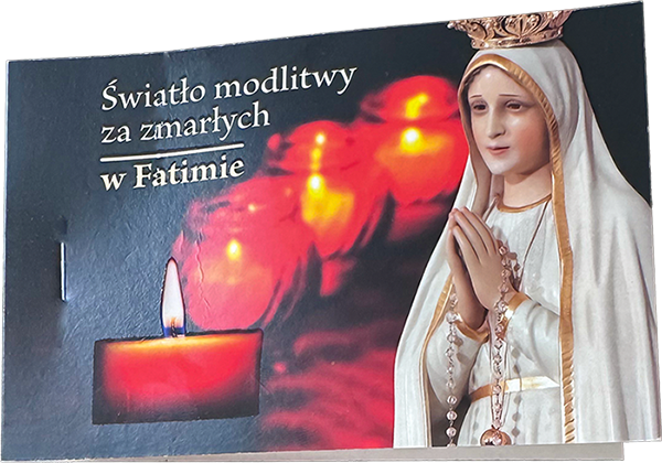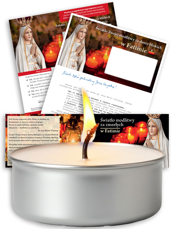 W pakiecie otrzymasz małą Świecę Pamięci, która będzie symbolizowała Twoją osobistą modlitwę za zmarłych. Gdy odeślesz ją do nas, przetopimy Twoją Świecę Pamięci razem z tysiącami innych świec w wielkie świece wotywne, które zawieziemy do Fatimy i zapalimy w Kaplicy Objawień Matki Bożej.